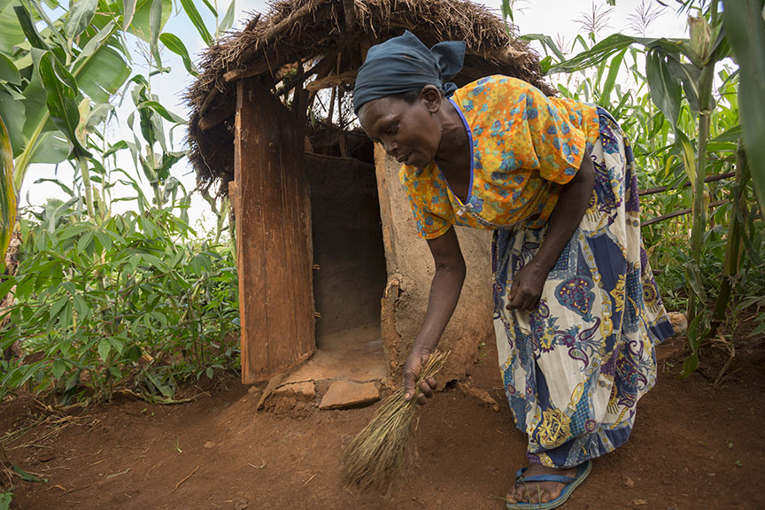 Catholic Relief Services’ (CRS) Integrated Water Resource Management Project (IRWM) in Bukwo, one of Uganda’s most remote and inaccessible districts, tackles two these two critical issues that adversely affect Dorine and her community: access to clean water, and open defecation. These programs, however, are carried out in a way that both empowers and builds the capacities of the communities CRS serves. “It’s critical to implement our program in a sustainable way, so that the community will be empowered, and the results can continue to last through the generations,” says IRWM’s Field Coordinator Martin Opio. Below, Mrs. Kokop Deos sweeps around the latrine she built for her family for the first time following CRS’ water, sanitation and hygiene interventions in the community.