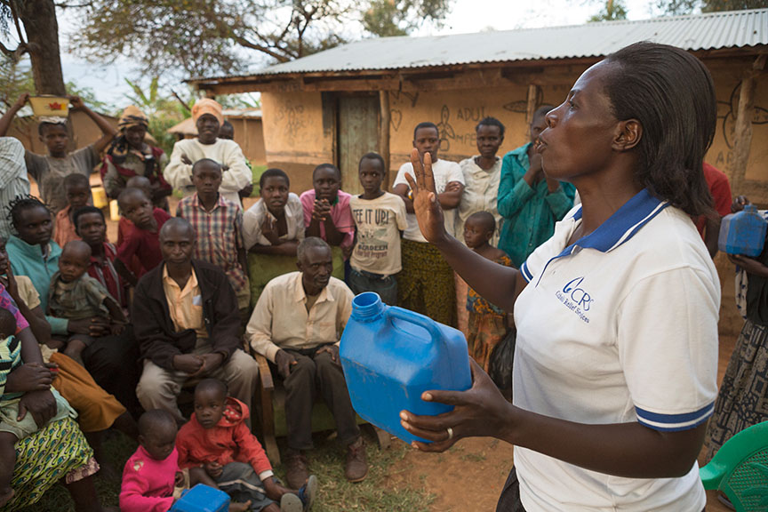 Our CRS truck pulls up to a new shallow well that will draw water for the first time today. In addition to the eager women and children running with their empty jerry cans, I see men streaming from their huts with their shovels, their wrenches, their fencing material. “What are they doing?” I ask Field Coordinator Opio. “They’re coming to help,” he replies.